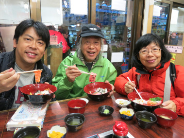 那天我和爸媽在清晨四時起床,四時半出發,到達築地食街已是五時多。當時每間知名食店門外都有多人守候,我們兵分兩路,到「河岸鮨文」和「大江戶」門外排隊。前者是擁有150年歷史的老舖,其手握壽司是天下一絕;後者專售大碗海鮮丼,內有各種刺身,單看門前照片已令人垂涎三尺。結果等了十多分鐘,才能進入「大江戶」,當我們吃著那碗鋪滿魚生的海鮮丼時,實在非常滿足。